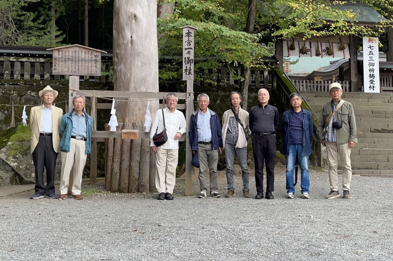 翌日は、縄文遺跡や国宝(縄文のビーナス、仮面の女神)や諏訪大社関連施設(御柱の木落し坂、大社本宮)を見学、本宮近くの民芸食事処で鰻と信州蕎麦の昼食をとり、いつまでこの関係を続けられるか名残を惜しみながら解散しました。時節柄、リンゴをお土産に買い求める参加者が多数いたこと、幹事が「散歩の途中で拾ってきた山栗」の甘露煮を参加者にお土産にしたことなど、皆喜んでいました。