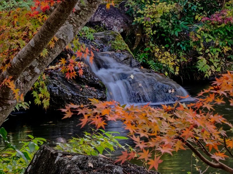 紅、黄、緑がよどよく混じったカラフルな眺めの中に、岩肌を滑り落ちて池にそそぐ水の流れを見つけた。