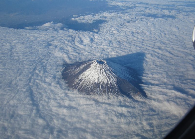 2013年の12月の初め、ハワイ本島のコナ市で開かれたある学会に出席した帰路に撮られた一枚。ホノルルを午前11時ごろ発ち搭乗機が10時間の飛行を終え、間もなく中部国際空港に下降を始めた時、突然眼下に現れた初冬の富士山。