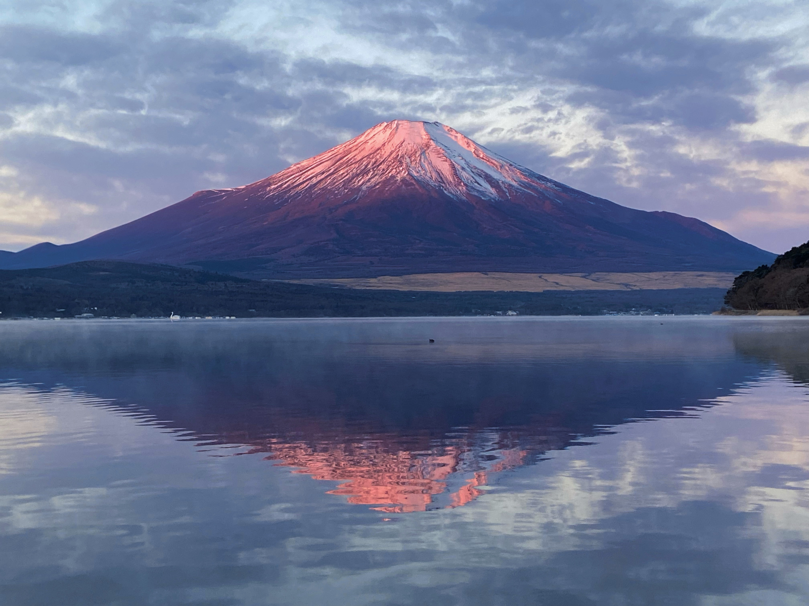 山中湖・平野の浜から眺めた早朝の富士山です。 静かな湖畔に映る富士山の姿がとても印象的でした。
