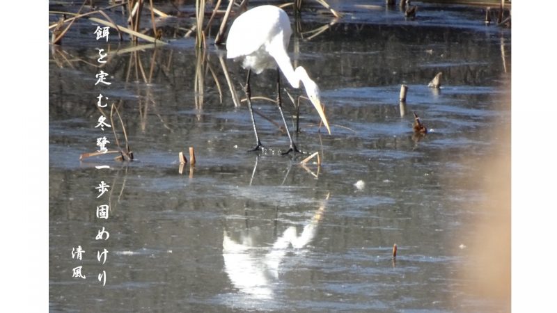 寒中真っただ中で最低気温が氷点下の毎日です。先週末、深谷から車で一時間程の北本自然観察公園に行って来ました。山雀、四十雀、百舌鳥、タジギ、コゲラなどの中、嘱目は凍った沼で餌を狙う鷺でした。掲句は、当日の嘱目吟です。
