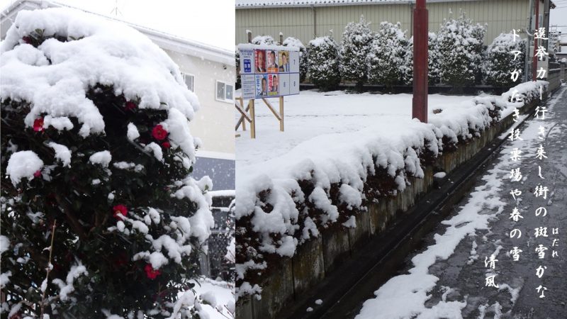 御多分に漏れず2/8総選挙の朝、春の雪に見舞われました。掲句は、当日の嘱目吟二句。季語の「斑雪」は、『「はだれ」または「はだれゆき」と読んで、まばらに降り積もった春の雪、または溶けかけてまだらに残っている雪をいう、あるいは、はらはらとまばらに降る雪のことも言いい、古くは「葉が少し傾くほどの雪“葉垂れ”」という説もある。』(角川歳時記) 「はだれ」をネットで検索すると、万葉集の「沫雪かはだれに降ると見るまでに流らへ散るは何の花そも」駿河采女(するがのうねめ)に行きついた。『「沫雪」は、はらはらと降る泡状の雪、泡のように消えやすい雪で、「淡雪」とは異なります。主として春の雪を言いますが、冬の雪にも言います。「はだれに」は、まだらにして融和密着しないでばらけているさまをいう擬態語』という注釈がありました。日本の政治も早く「ばらけている」状態を脱して欲しいものです。