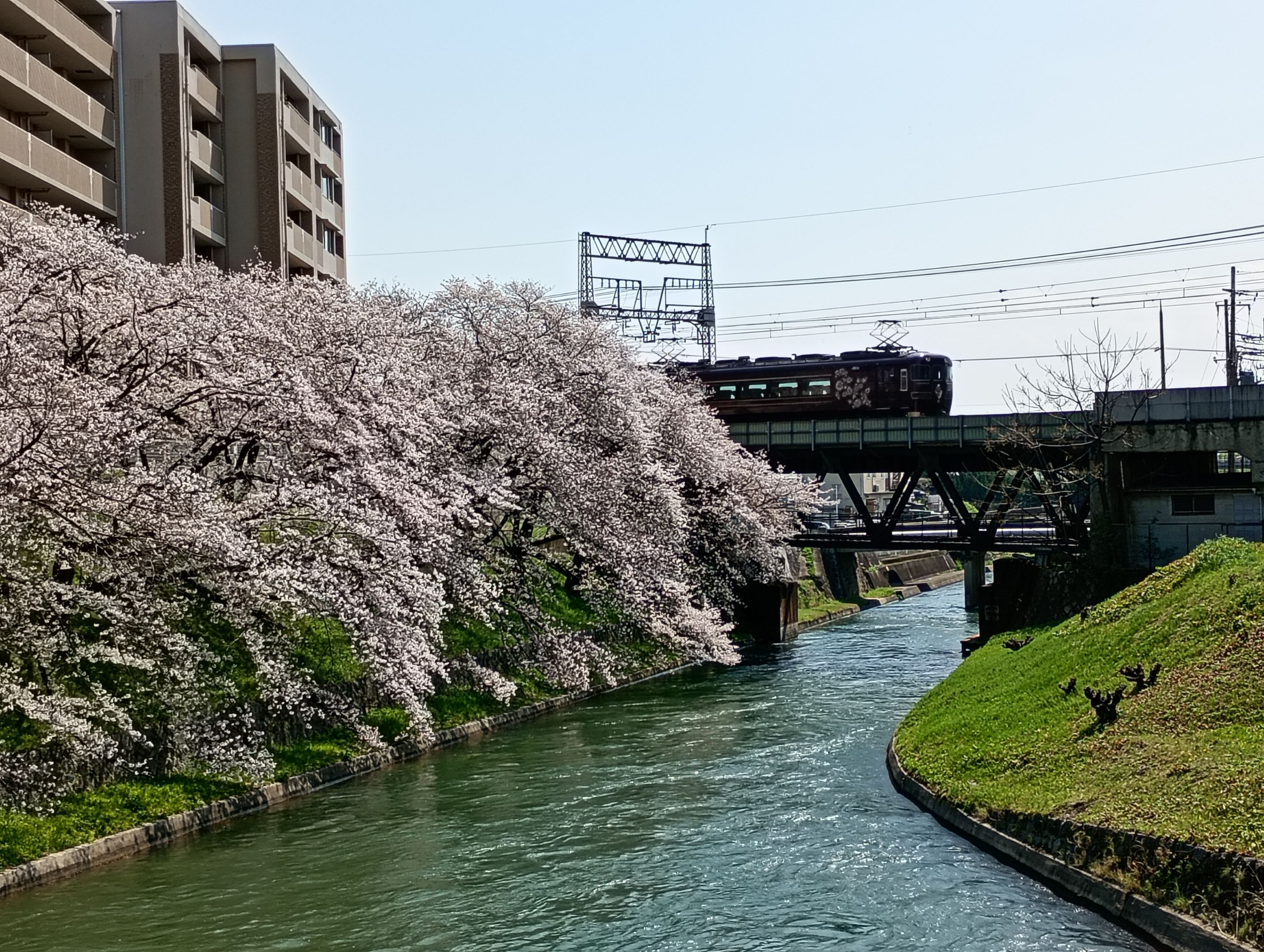 京都・伏見を流れる琵琶湖疎水沿いの桜です。 奥を走る電車は近鉄線です。