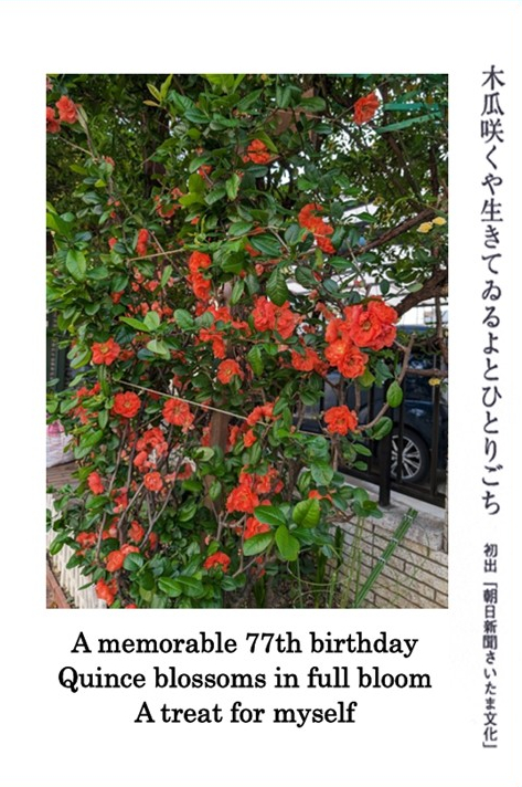 喜寿を迎えました。庭では木瓜の花が今年も見事に咲きました。人生の余慶としてながめています。掲句は、朝日新聞さいたま文化入選句。