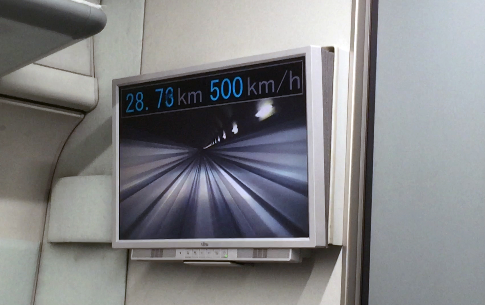 【鉄オタ】1964年東京オリンピックとともに出来た『新幹線』を『夢の超特急』と呼びました。そして再び『夢の超特急』が試乗可能になっています。早速乗ってきました。写真は走行中の速度計と前方の画面です。500km/時です。乗車は専用入り口からです。車両の姿は見えません。新幹線とよく似た車内です。各座席列に窓があって前方に写真のパネルがあります。発車と共に揺れを感じますが、浮遊すると揺れも無くなります。窓の外はほぼトンネルでときおり外の風景も見えます。あとは写真にあるパネルの速度表示が変化することと前方の風景画面です。本当に走っていると思いますが、乗車時に車両全体を見せないので余計にディズニーランドのスターツアーズのようにフライトシミュレータの機構と窓外にモニターを組み合わせれば簡単じゃないでしょうか?『夢の超特急』なのにUEC出身の技術屋の何という夢の無さでしょう。