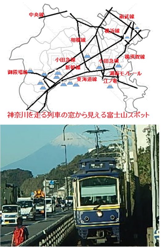 列車から見える富士山を地図で紹介しております。列車から富士山を見る場合には先頭号車か最後尾の号車をお勧めします。お勧めは外国人観光客が多い、江ノ電です。七里ケ浜から稲村ケ岬の間では絶景の富士山と江ノ電が見えます。