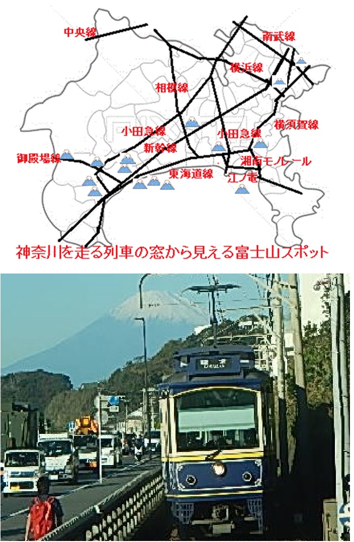 列車から見える富士山を地図で紹介しております。列車から富士山を見る場合には先頭号車か最後尾の号車をお勧めします。お勧めは外国人観光客が多い、江ノ電です。七里ケ浜から稲村ケ岬の間では絶景の富士山と江ノ電が見えます。