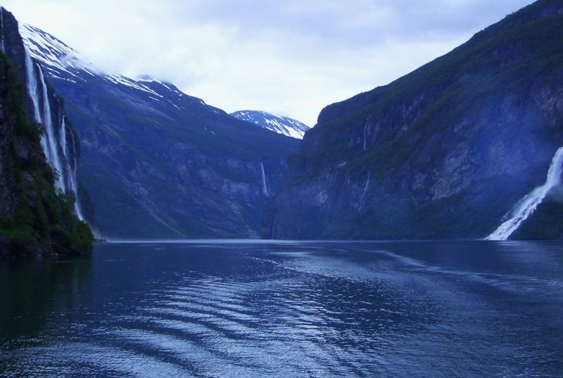 2005年6月、ストックホルムから列車で北上し、スカンジナビア半島を横断してノルウェーのトロンハイムへと向かいました。そこからバスとフェリーを乗り継ぎ、ベルゲンを目指す世界遺産フィヨルドの旅が始まります。バスが新緑に包まれた海辺の街を出発すると、風景は一変。標高を上げるにつれ、目の前には白銀の雪原が広がります。この雪原の融氷水が、垂直に切り立った岸壁を幾筋もの滝となって流れ落ち、フィヨルド特有の絶景を創り出していました。山を越えては海岸線へ降り、入り組んだ湾岸を走ってはフェリーに揺られる――その繰り返しを経て、旅は進みます。旅の圧巻は、世界遺産の中心地ガイランゲルでの一泊でした。断崖に囲まれた細長い湾の最奥に位置するこの小さな町で、大自然の静寂に抱かれるようにして佇む真っ白な豪華客船の姿は、今も深く心に残っています。